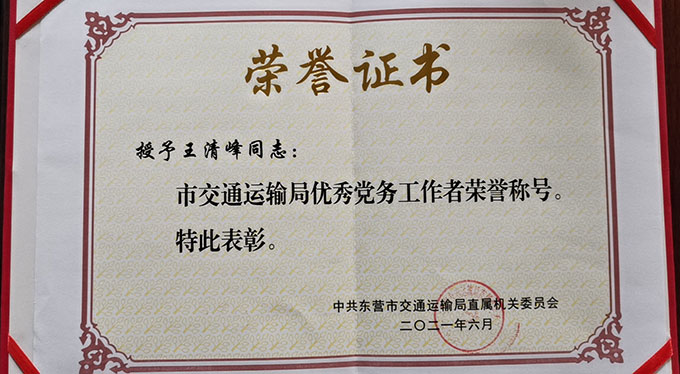 • 王清峰榮獲“市交通運輸局優(yōu)秀黨務工作者”