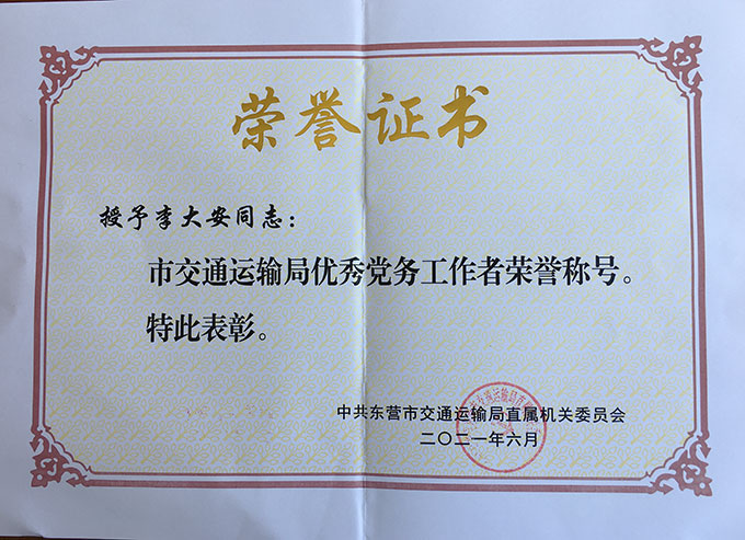 • 李大安榮獲“市交通運輸局優(yōu)秀黨務工作者”